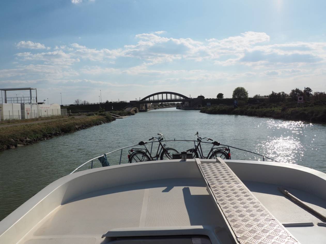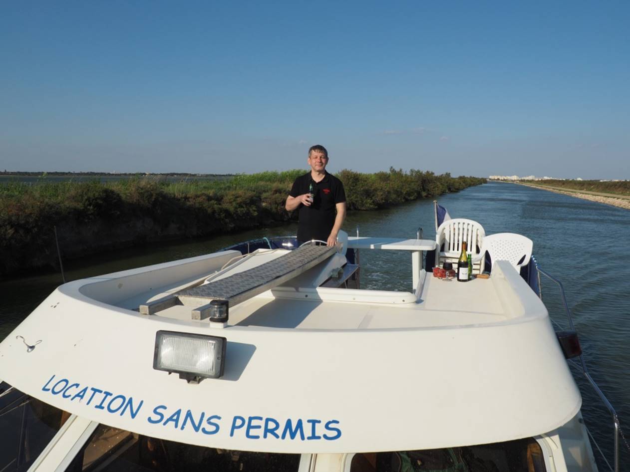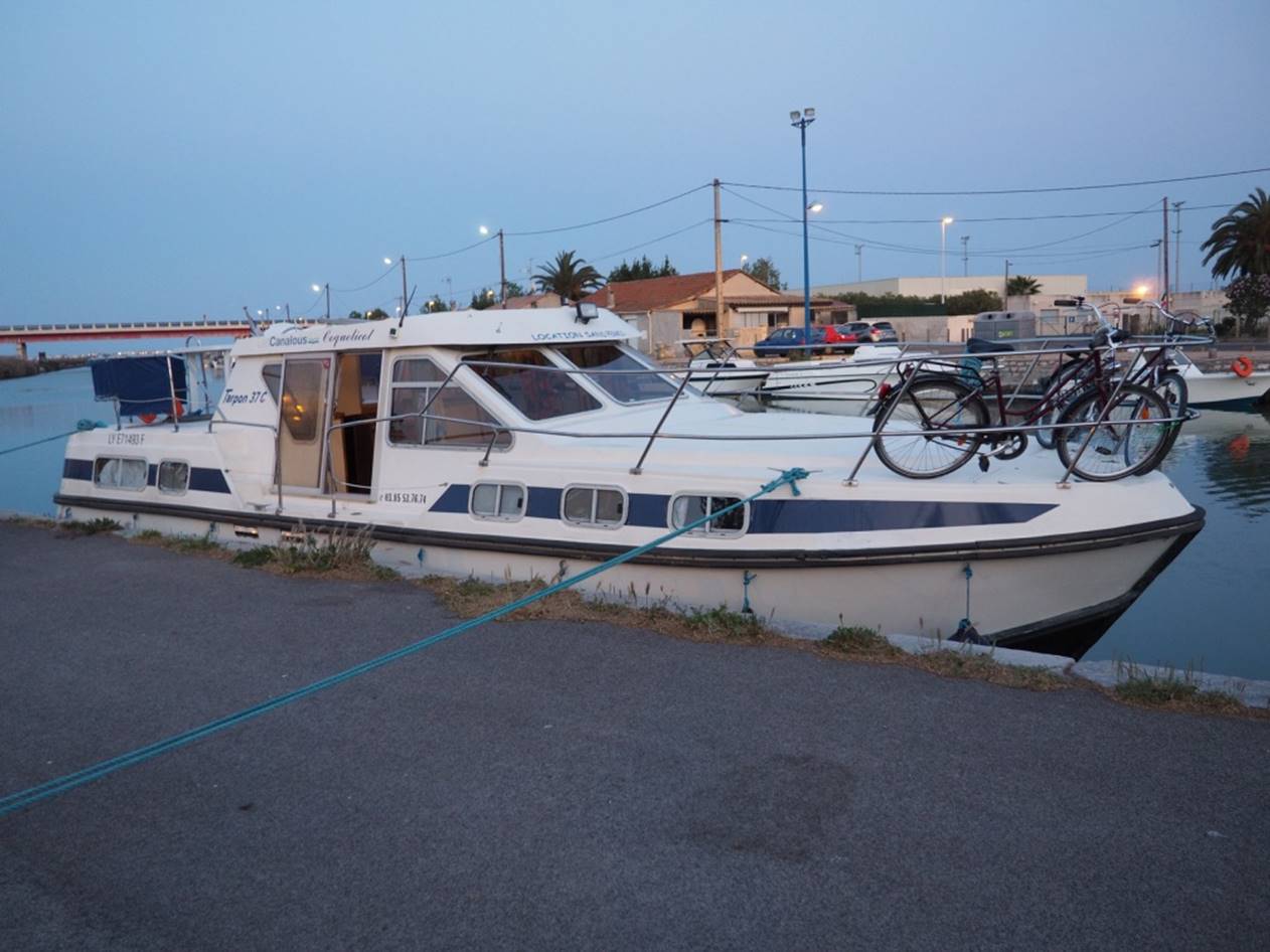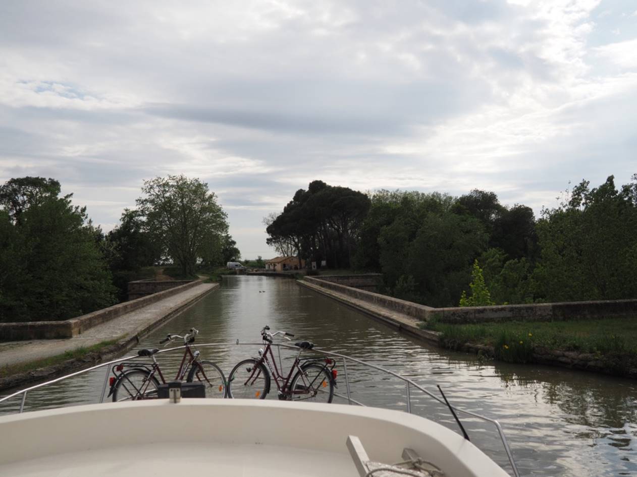 С утра гуляли по маленькому курортному городу Carnon. Город в начале мая совершенно пустой, не сезон.. Вечером получили лодку, прошел инструктаж, немного практики и поплыли (уже сам, лицензии на управление лодкой не нужно) на запад по каналу. Далее был подъемный мост, который поднимают только два раза в день, посему рядом с ним припарковались и переночевали.