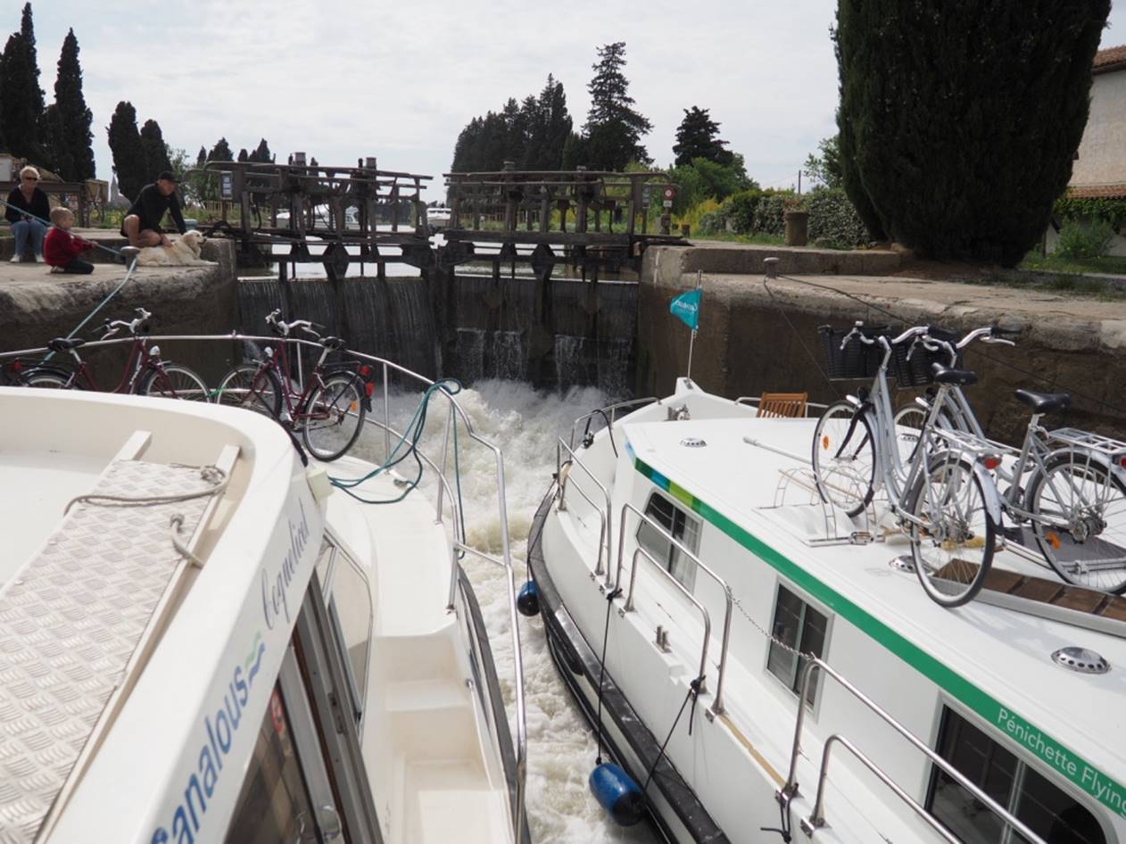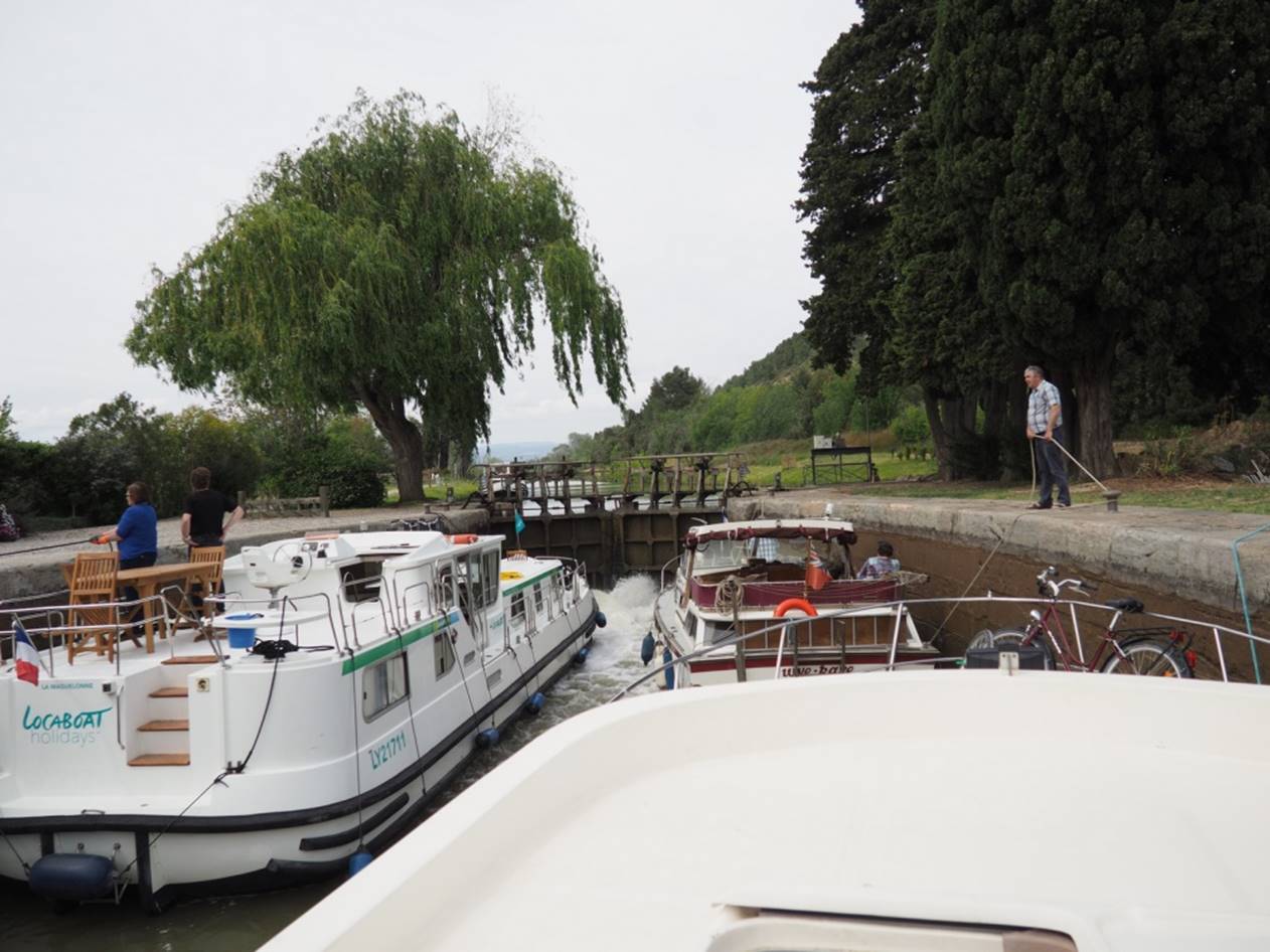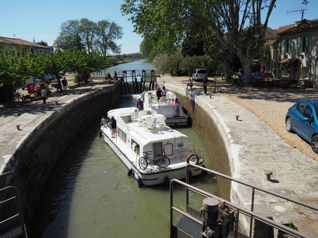 набивается по 4 лодки. Доплыли до города Beziers, там остались на ночь. Сам город не понравился. Мелкие