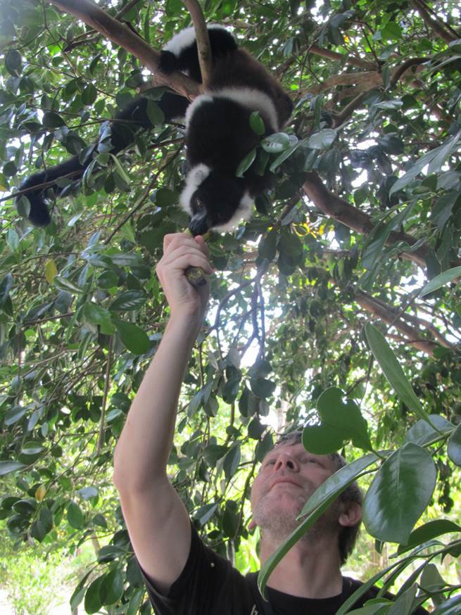 Переезд до Пальмариума. Сам отель расположен на озере, добраться можно только на лодке (1.5 часа по двум озерам, сцепленным каналом). Около отеля в лесу живут несколько видов лемуров, которых можно кормить (в отличие от национальных парков). Поэтому они постоянно шляются по отелю и даже приходят прямо к бунгало. Ночью прогулка в лес на соседний остров - наблюдать за лемурами Ай-Ай (они же - руконожки), которые питаются кокосами и без проблем их распиливают своим пальцем. Опять на дороге встретили хамелеона. Тот был очень не доволен нашим к нему повышенным вниманием -)