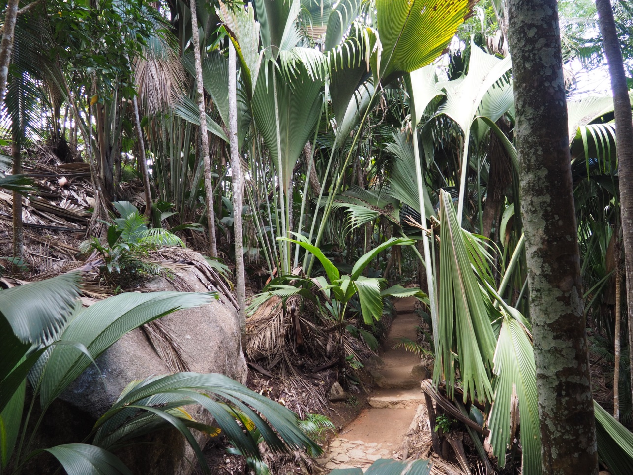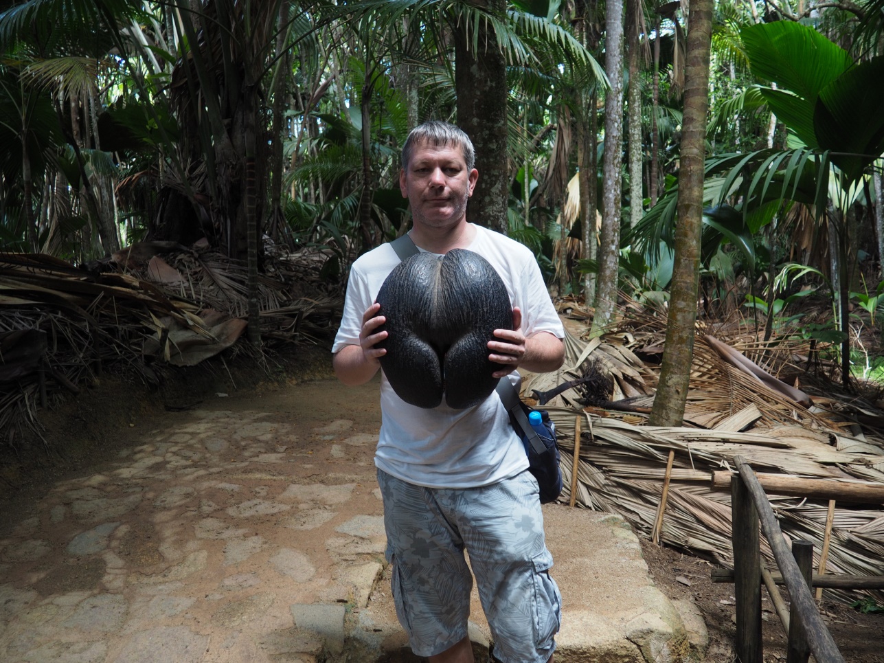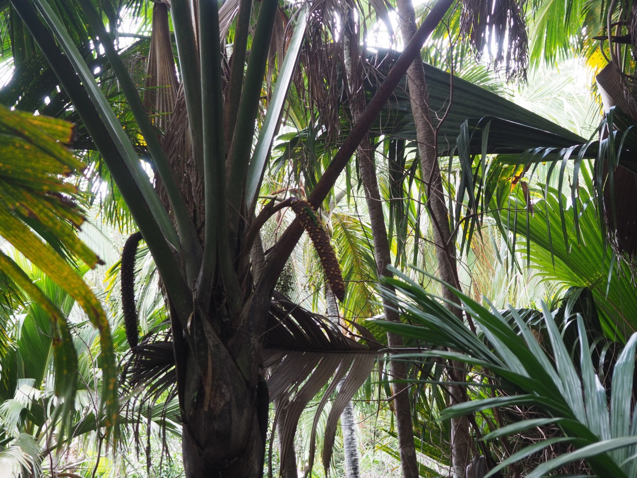 Катались по Praslin.. Заехали в парк, где растут известные эндемики Сейшел – Coco de Mer. Это особый вид кокоса, своеобразной формы. Созревает он много лет.. Кстати, печать в паспорте при въезде в страну сделана в форме этого кокоса.