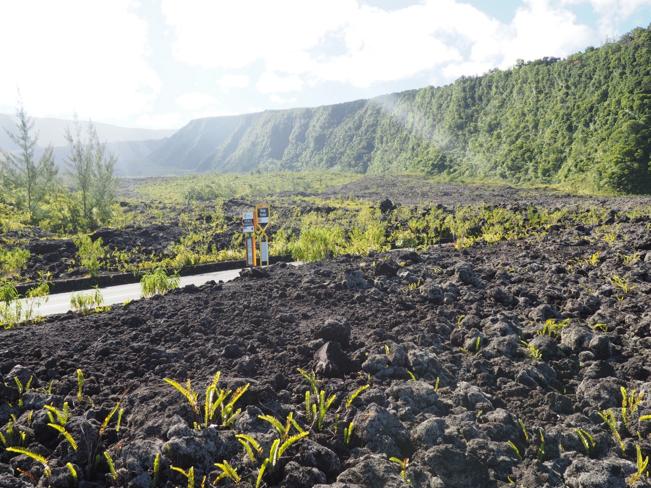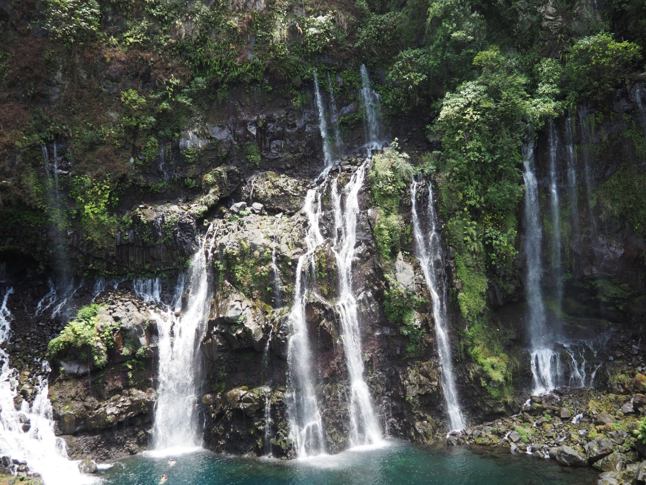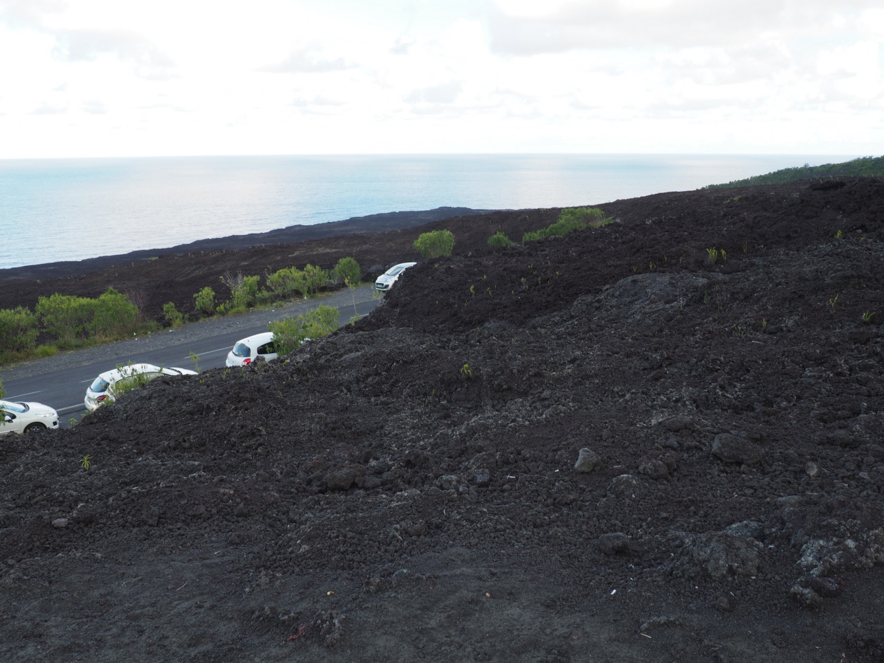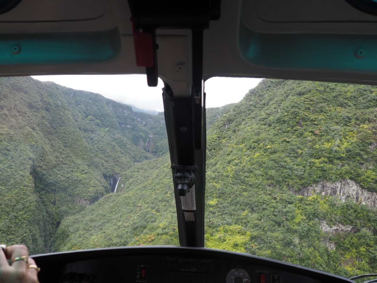 Отправились на Cascade de Grand Galet. Далее на восточную часть острова смотреть лавовые поля разных лет. Каждое подписано, в каком году это случилось. Дорогу, естественно, приходится отстраивать каждый раз заново. Потом полехали в залив с водопадами – Anse de Las Cascades.