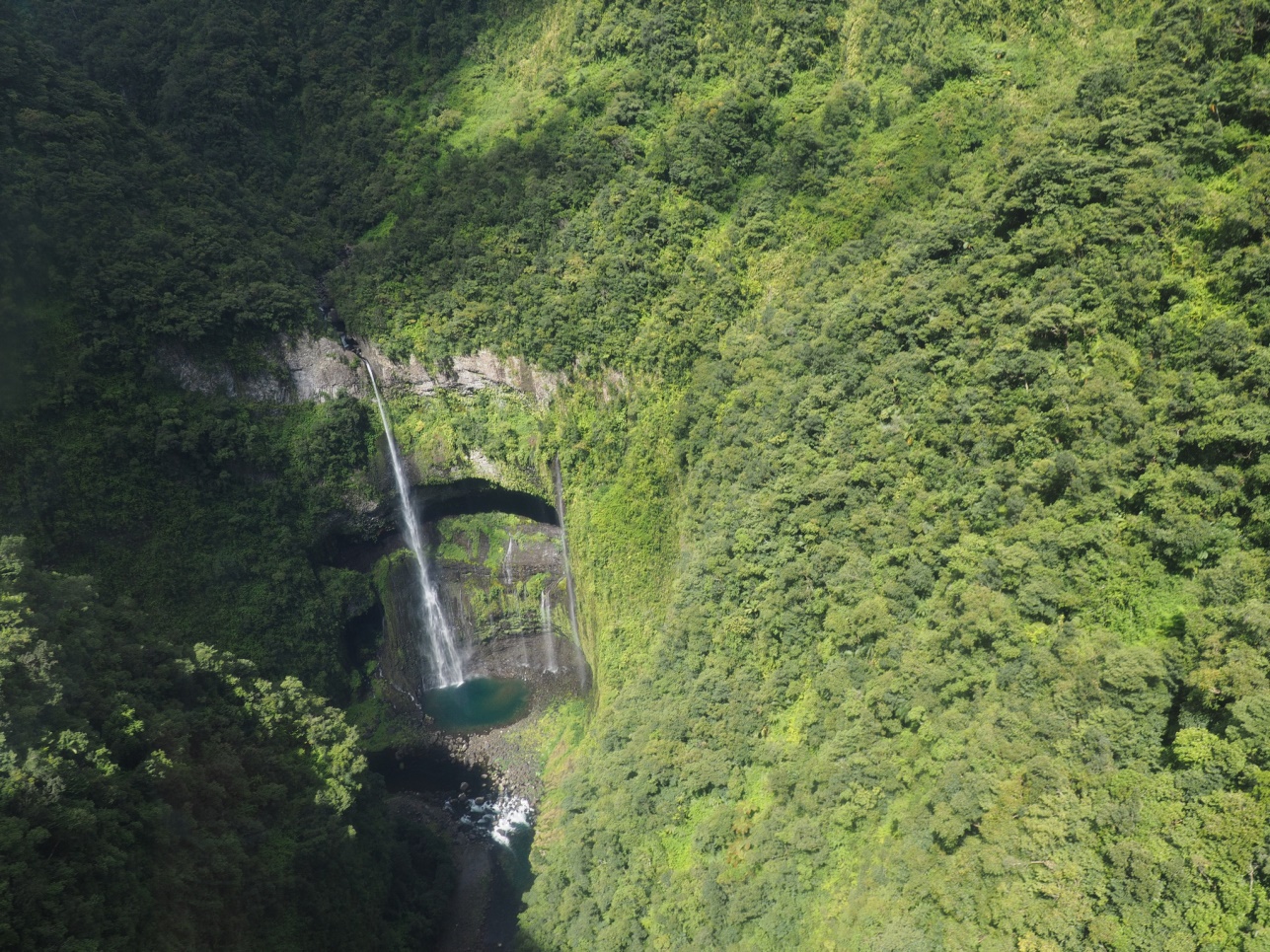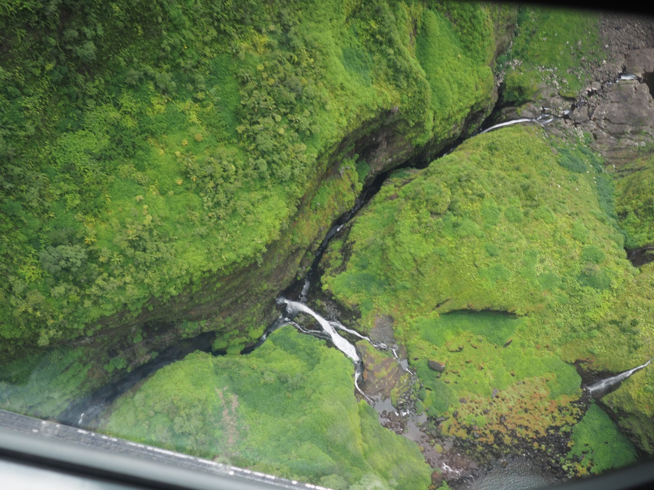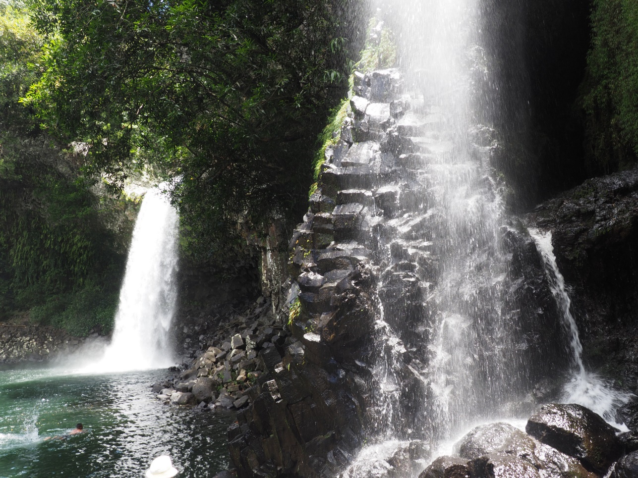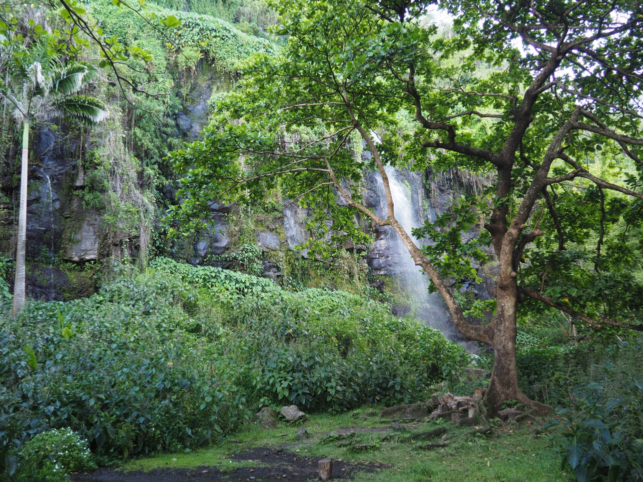 Отправились на Cascade de Grand Galet. Далее на восточную часть острова смотреть лавовые поля разных лет. Каждое подписано, в каком году это случилось. Дорогу, естественно, приходится отстраивать каждый раз заново. Потом полехали в залив с водопадами – Anse de Las Cascades.