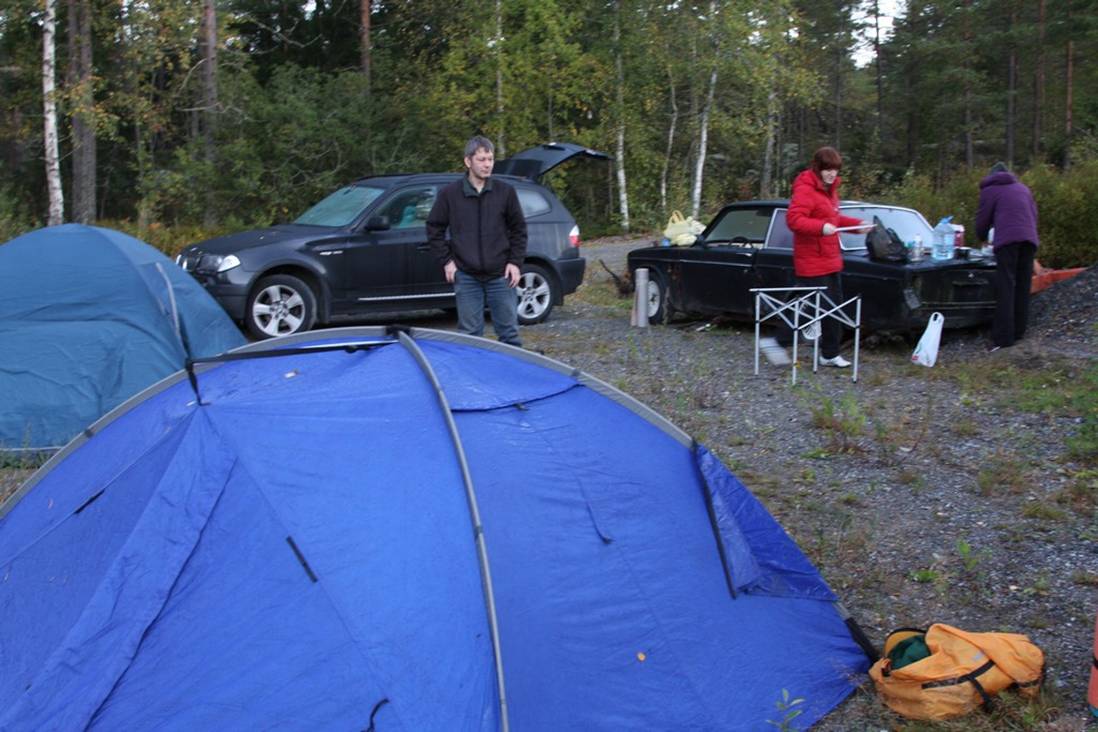 Нашли место для ночевки в палатках рядом с какой-то заброшенной машиной, послужившей столом.