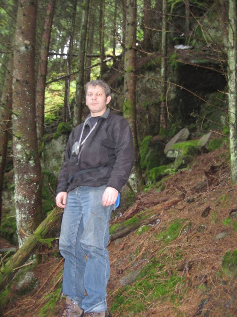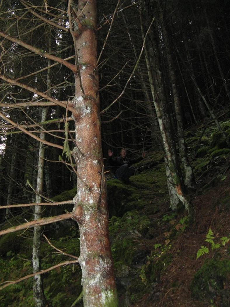 Пробираться на точку надо было через лес. Путь никак не обозначен, посему искали, где можно спуститься, сами. Везде практически отвесные участки, но найти места, пригодные для спуска, можно. Опять же, елки очень помогают – за них можно держаться. Но пробираться через еловый лес, растущий на спуске градусов в 40-50, занятие еще то J. После леса полезли еще на одну точку, где к водопаду можно подойти вплотную.
