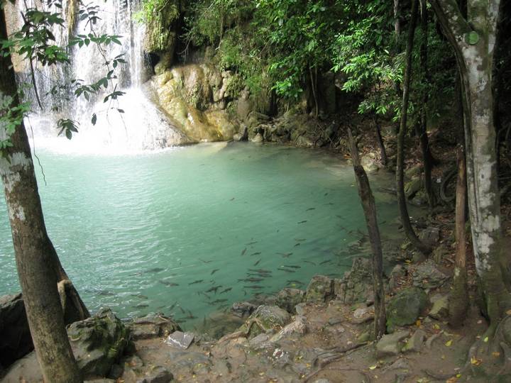 После такого захотелось искупаться в водопаде на 3-м уровне.. Кругом предупреждающие таблички, что вещи без присмотра не оставлять, обезьяны могут утащить.. Залез я в этот водопад.. А там рыбы немеряно, и она кусается за пятки. Не больно, но не приятно.. Ибо их много, налетают стаями.. Приходилось постоянно двигаться, чтоб не приставали.. Бр.
