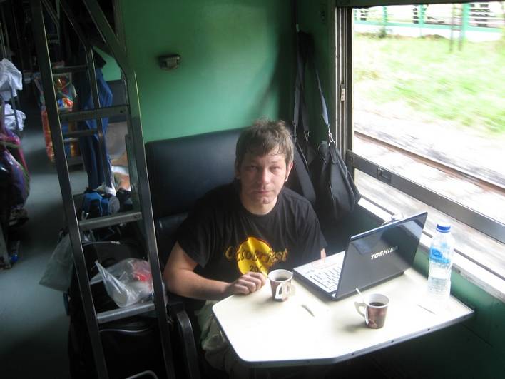 Поезд опаздывал на 3 часа. Вместо 14-ти ехал 17-ть. Ехали, смотрели в окна. Расстояние от станции до станции указано с точностью до метра. Уже знакомая веселая проводница постоянно предлагала чтонить купить и трогала Серегу за живот с хихиканьем (понравился, видимо (живот)). В этом поезде, как мы заметили, ехало достаточно много европейцев. Видимо это любители долгих путешествий с минимумом затрат. Некоторые, как обычно, были с тайками.