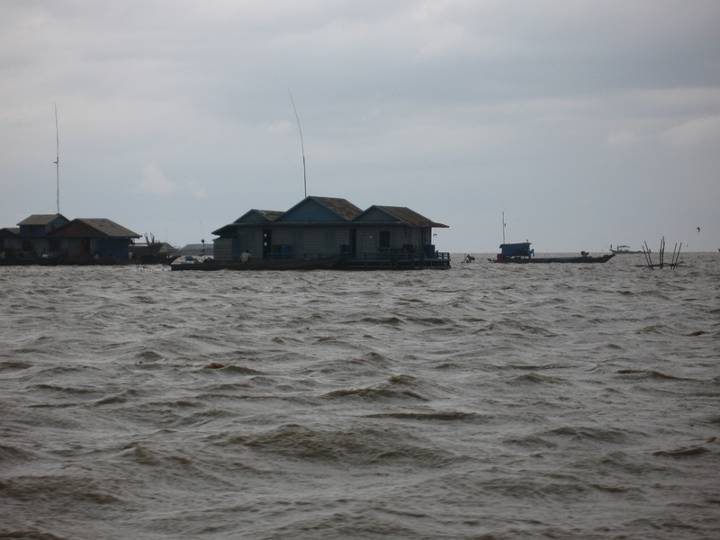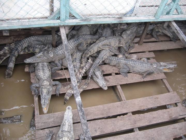 На водопаде встретили какого-то самого крутого и известного Камбоджийского боксера (об этом нам сказал водитель). Далее переезд в другую сторону от Сиам Реапа – на озеро Tonle Sap. На лодке привезли на середину озера, в плавучую деревню. Дома стоят на сваях прямо по середине озера. Движение лодок там просто жуткое – то и дело с кем-то разъезжались. Заехали в одно из таких зданий. Там оказалась крокодиловая ферма с маленькими крокодилами и магазин. Выпили по пиву.