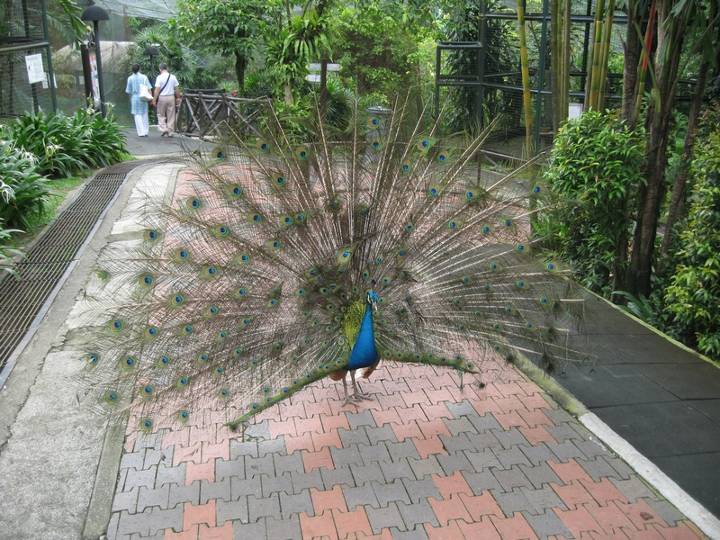 Позавтракали Малайское едой в KLCC в Twin Towers, поехали по паркам (они в одном месте собраны). Первое и самое потрясающее – парк птиц. Написано, что это самый большой парк, где птицы летают и ходят вокруг. Не, некоторые, типа страусов, естественно в клетках. А то клюнет по голове – мало не покажется. Как и одна злобная цапля – если поднести руку к клетке она на нее кидается и пытается клюнуть. А так – летают вокруг. Попугаи, павлины и еще куча всего. Павлины там вообще офигевшие. Ходят рядом, не боятся вообще. Показывают себя со всех сторон, распустив хвост.
