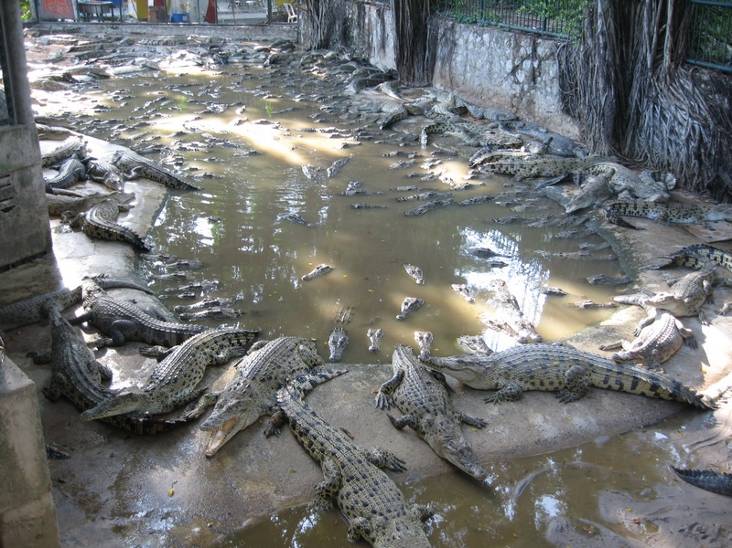 Паттая. Самый непонравившийся город в Таиланде. Кругом русские. Все дорого. Не так опрятно, как в том же Чинг Мае, например. Первый раз за всю поездку увидели море. Но в него не полезли: бегом, чтоб время не терять, поехали на крокодиловую ферму. Крокодилов немеряно.. Покормили оных тут же продающейся курицей. Хлопок челюстями – это огого.