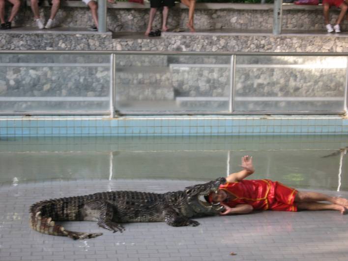 Далее шоу с крокодилами. Что там только дрессировщики с ними не делают – на руках и за хвост таскают, голову в пасть суют, руки тоже.