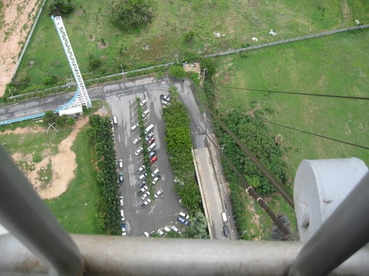 Ну, отлично. Прицепили к тросу, и вниз. А ветер тем временем поднялся не детский. Страшно. Но с тиграми страшнее J. До кучи в середине пути позвонил Серега, сказать, что он уехал. Стараясь не выронить мобилу, пообщался во время спуска. Только приехал, через секунд 10 как ливанет.. Вовремя. Примерно так, только в другую сторону и без всяких люлек. Ремни и крючок.